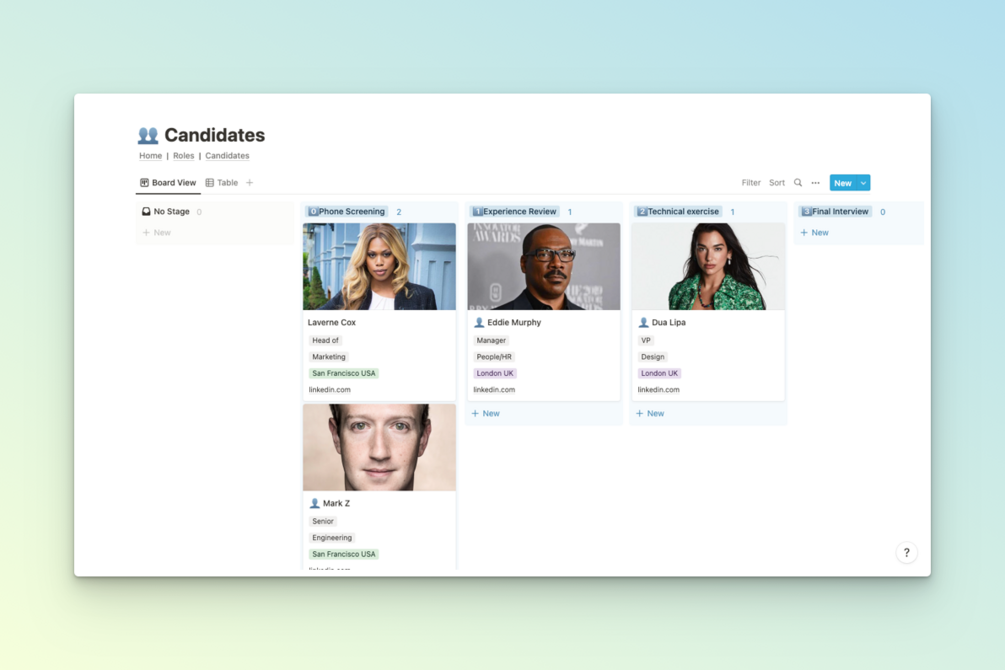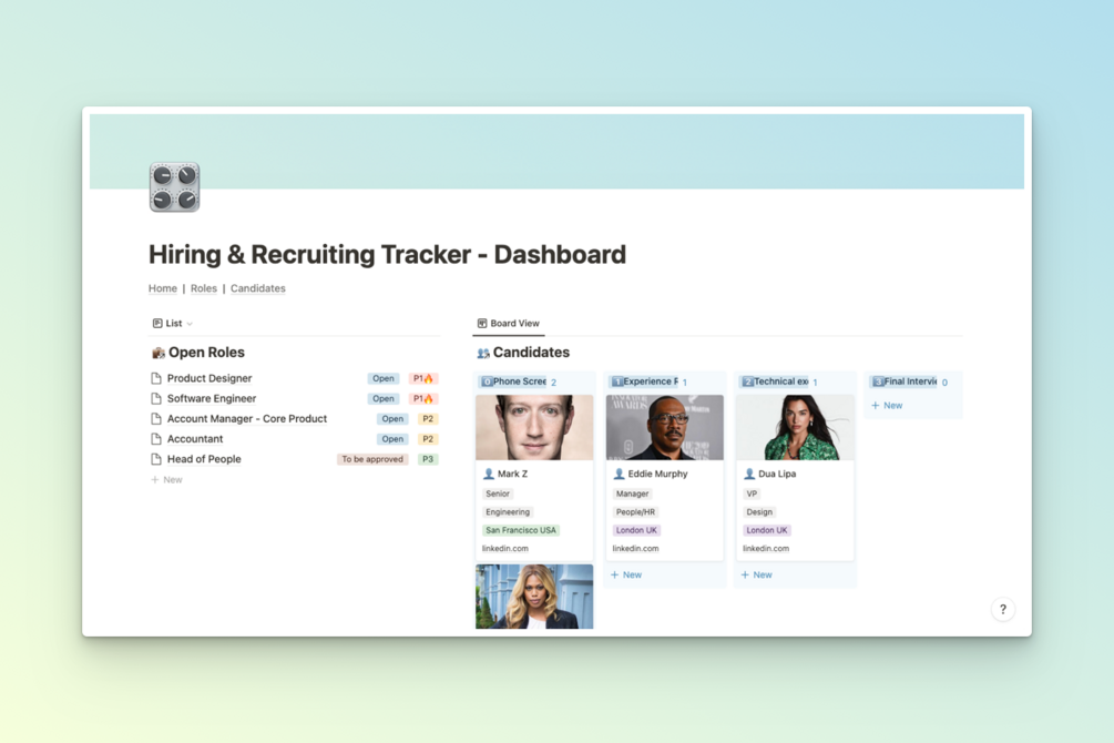 This template will help you to keep track of all open roles and your candidate pipeline. The idea is to make it easier for you to add and move candidates through your hiring and recruiting process.
